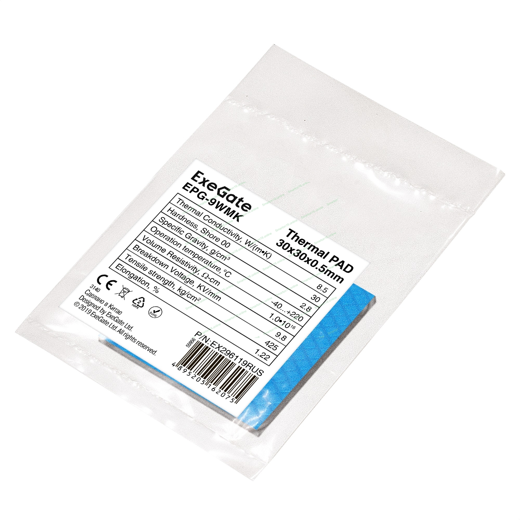 Термопрокладка ExeGate EPG-9WMK (30x30x0.5 мм, 8,5 Вт/ (м•К), теплопроводящая клейкая двухсторонняя)