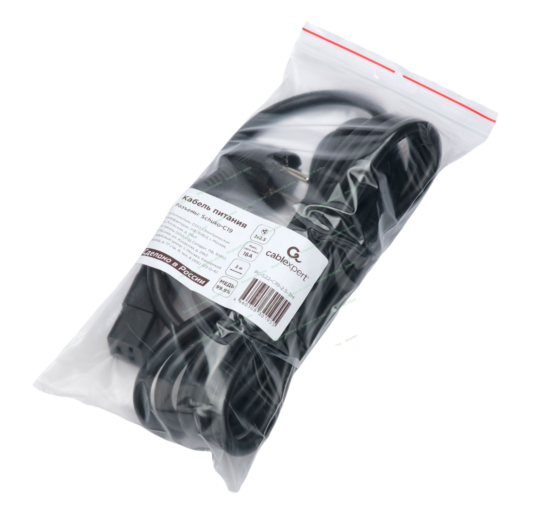 Кабель питания Cablexpert PC-S22-C19-2.5-3M, Schuko-C19, 3x2.5мм2, 16A, с заземлением, медь, 3м, черный, пакет