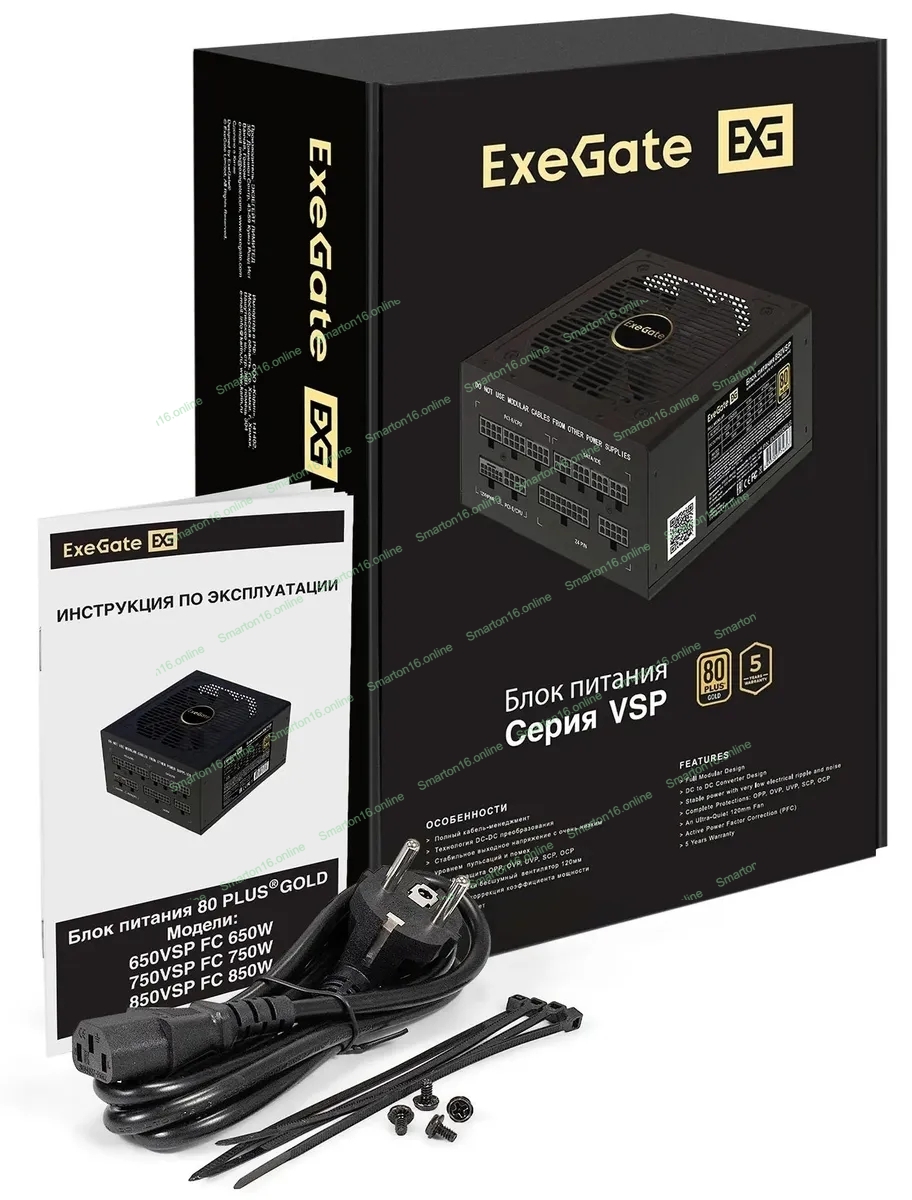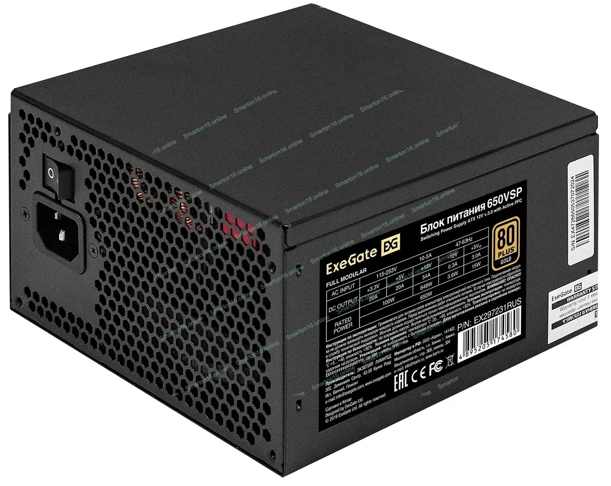 Блок питания 650W ExeGate 80 PLUS® GOLD 650VSP FС (ATX3.0, APFC, КПД 90% (80 PLUS Gold), 120мм fan, 24pin, 2x(4+4)pin, PCIE5.0/12VHPWR, 2xPCI-E, 6xSATA, 3xIDE, 1xFDD, Full Cable Management, black, Color box)