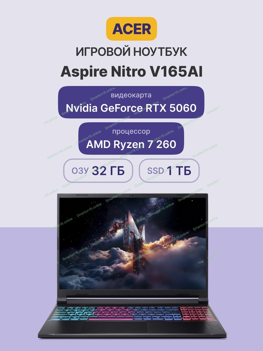 Ноутбук Acer Aspire Nitro V165AI ANV16S-41-R570 16"(2560x1600 (матовый) IPS)/AMD Ryzen 7 260(3.8Ghz)/32Gb/1024PCISSD Gb/noDVD/Ext:NVIDIA GeForce RTX 5060(8192Mb)/Cam/BT/WiFi/76WHr/war 1y/2.1kg/Silver/NoOS