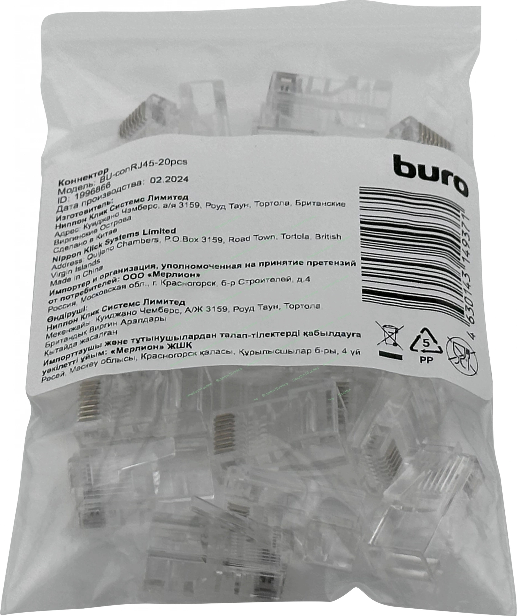 Коннектор Buro RJ45 прозрачный (упак.:20шт)