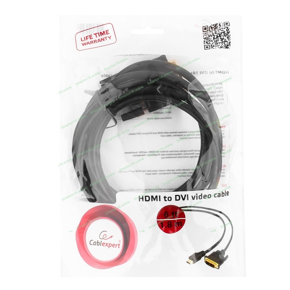 Кабель HDMI-DVI Cablexpert CC-HDMI-DVI-6, 19M/19M, single link, медь, позол.разъемы, экран, 1.8м, черный, пакет