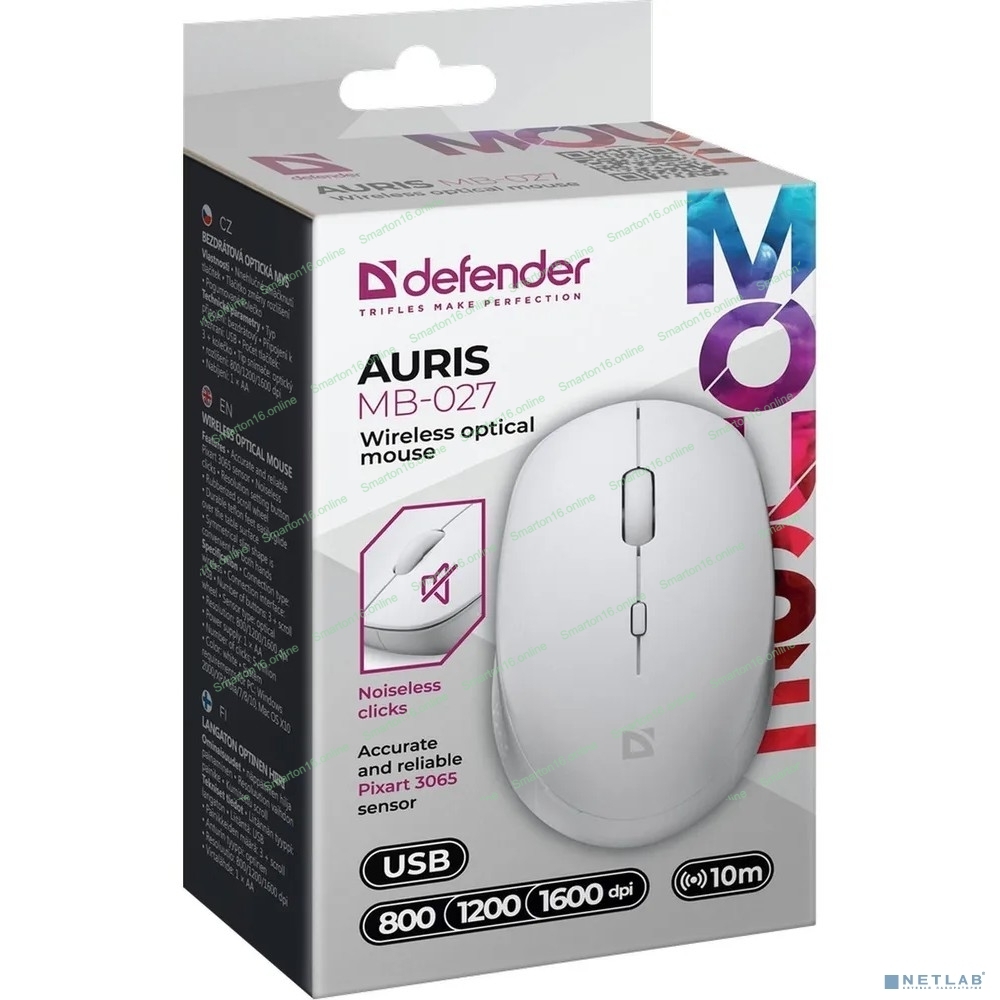 Мышь беспроводная Defender Auris MB-027 белый, 1600 dpi, радиоканал, USB, кнопки - 4