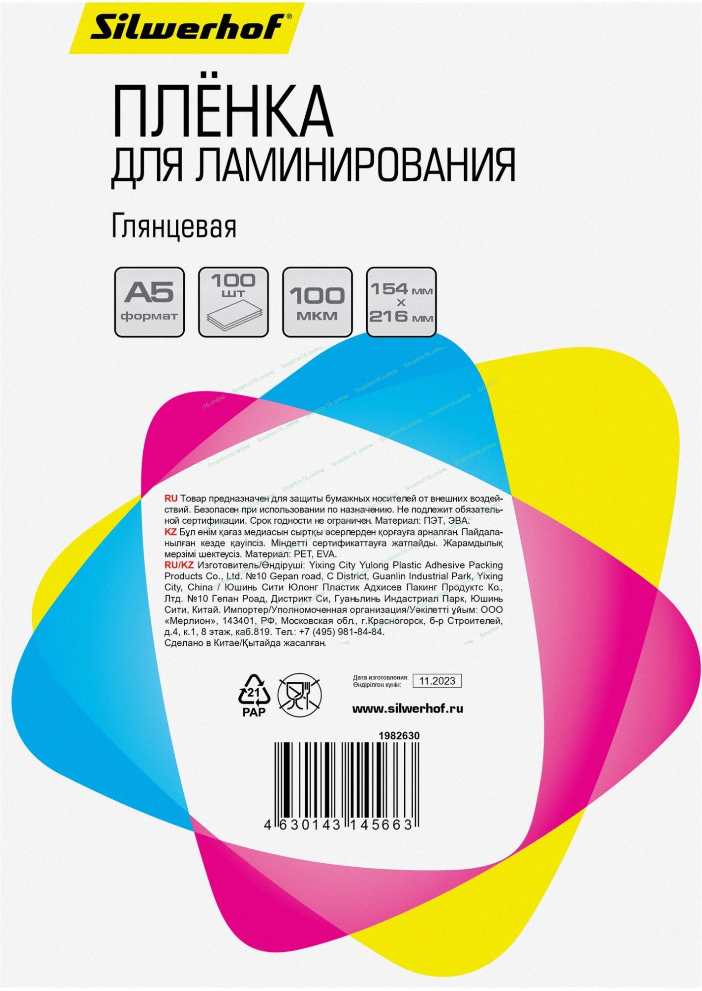 Пленка для ламинирования Silwerhof 100мкм A5 (100шт) глянцевая 154x216мм