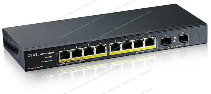 Коммутатор PoE+ Zyxel GS1100-10HP, 8xGE PoE+, 2xSFP, настольный, бесшумный, бюджет PoE 130 Вт