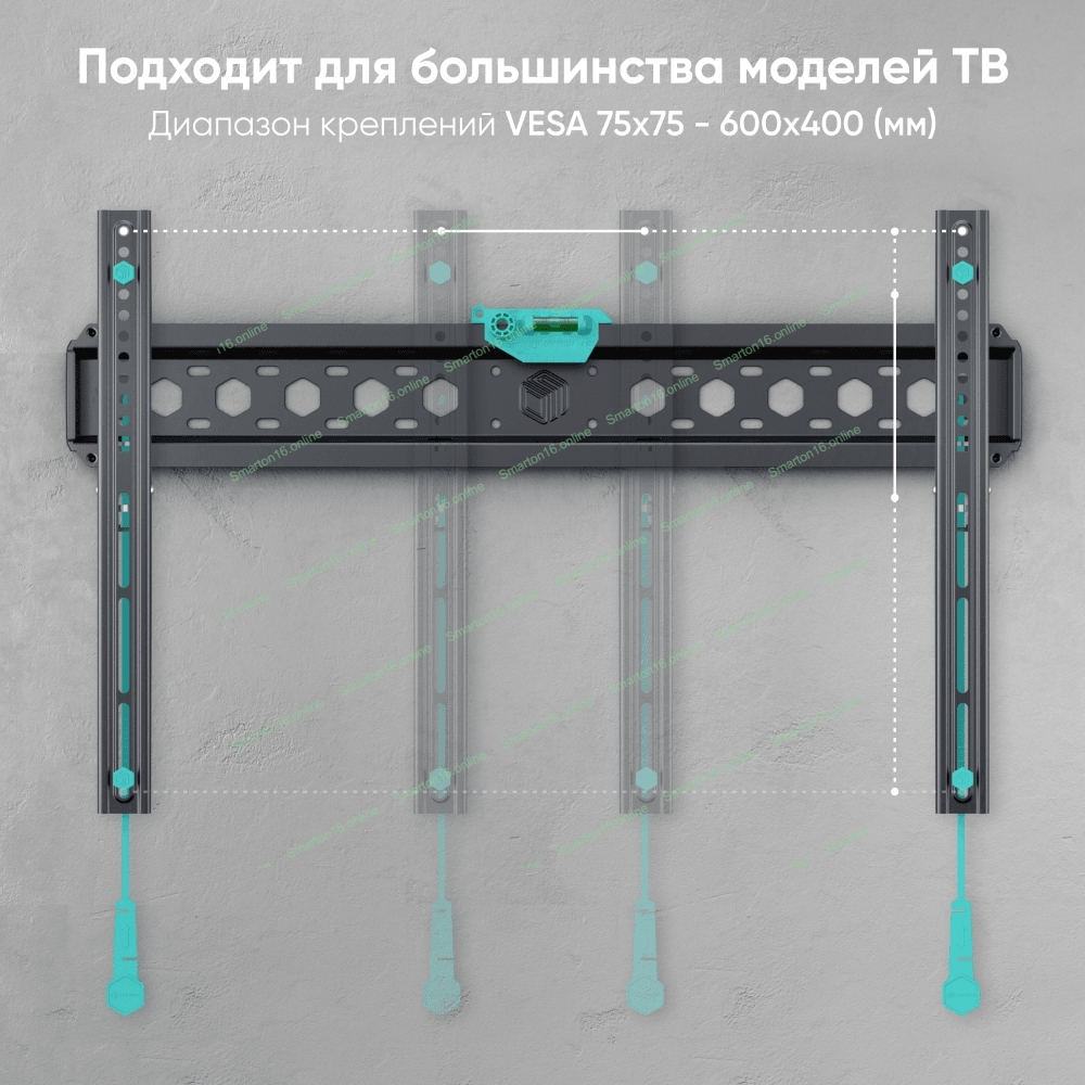 VESA: 75x75, 100x100, 100x200, 200x100, 200x200, 200x300, 200x400, 300x100, 300x200, 300x300, 300x400, 400x200, 400x300,400x400 мм