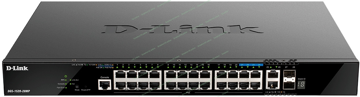 Коммутатор управляемый L3 стекируемый D-Link DGS-1520-28MP/A1A с 20 портами 10/100/1000Base-T, 4 портами 100/1000/2.5Gbase-T, 2 портами 10Gbase-T и 2 портами 10Gbase-X SFP+