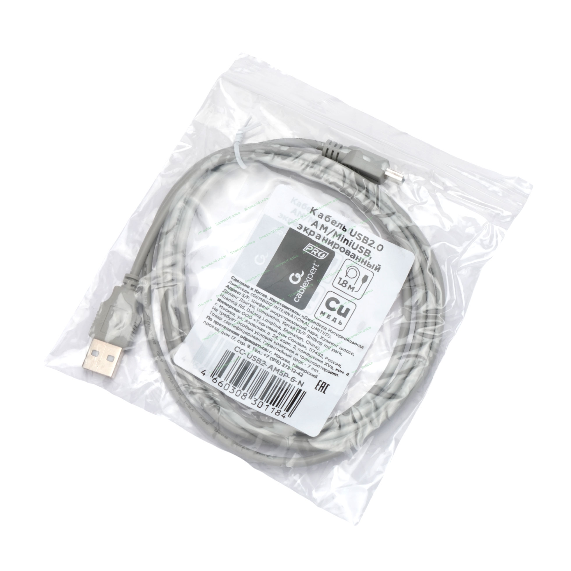 Кабель USB2.0 Cablexpert CC-USB2-AM5P-6-N, AM/MiniUSB, медь, экран, Pro, 1.8м серый, пакет