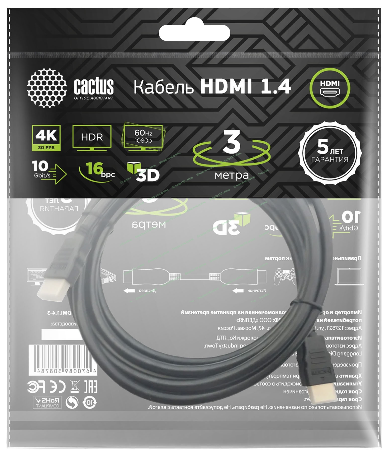 Кабель аудио-видео Cactus CS-HDMI.1.4-3 HDMI (m)/HDMI (m) 3м. позолоченные контакты черный
