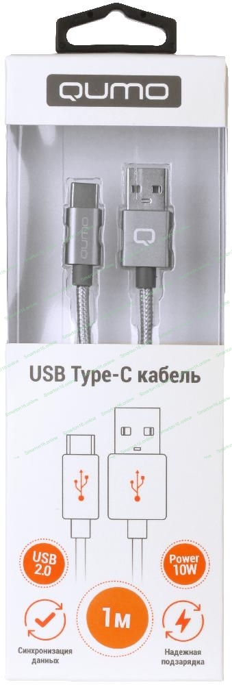 Кабель Qumo Type-С кабель, 1м, USB 2.0, 5В, 2А, 10Вт, тканевая оплетка, стальной коннектор, серый космос