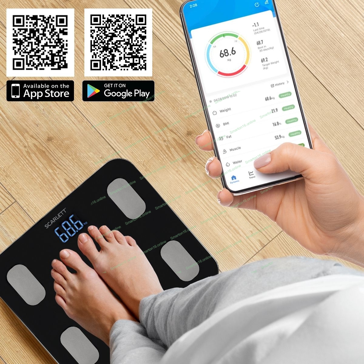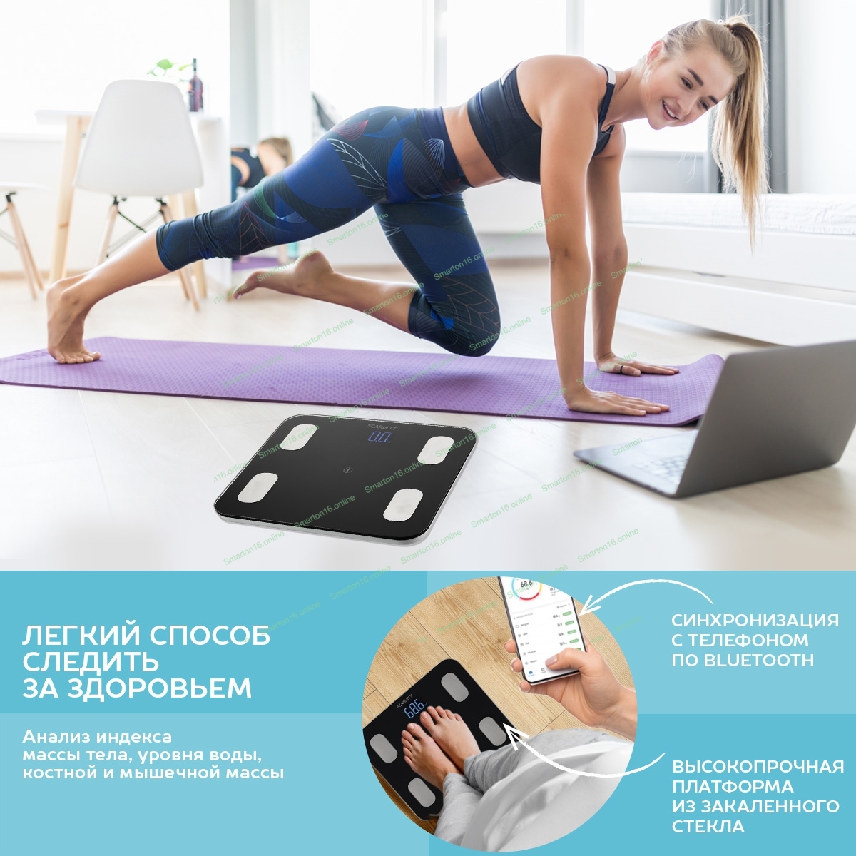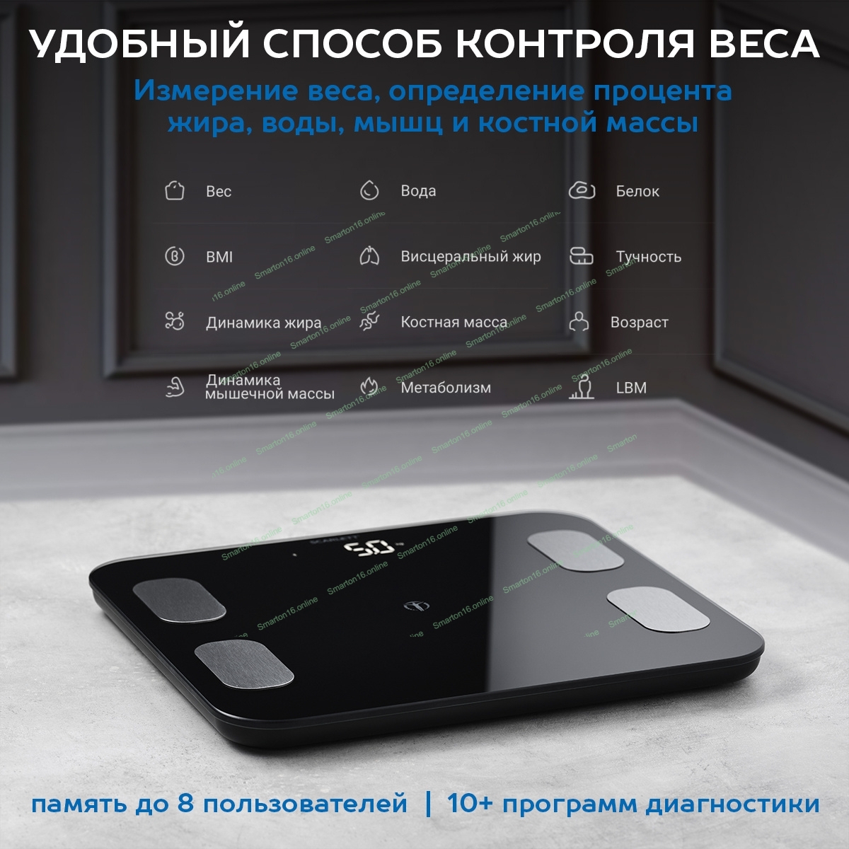 Тип: Диагностические; Материал корпуса: ABS-пластик и закаленное стекло; Максимальный вес, кг: 150; Цена деления, г: 100; Измерение уровня жира: Да; Измерение уровня воды: Да; Измерение мышечной массы: Да; Измерение костной массы: Да; Функция расчета ежедневной нормы калорий: Да; Прорезиненные ножки для устойчивости: Да; Особенности модели: Возможность синхронизации с Apple Health Хранение статистики в приложении;