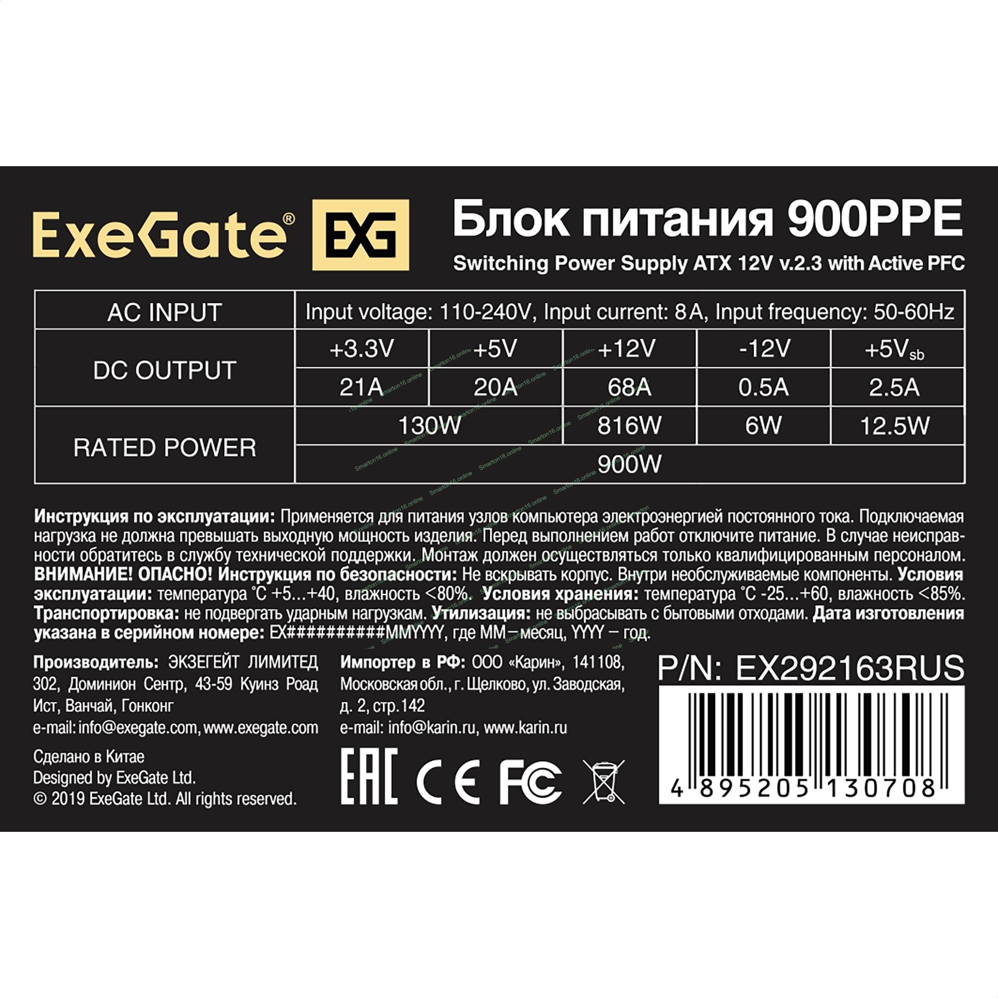 Блок питания ExeGate 900PPE (EX292163RUS-PC), 900Вт, 80 PLUS, 120мм, черный