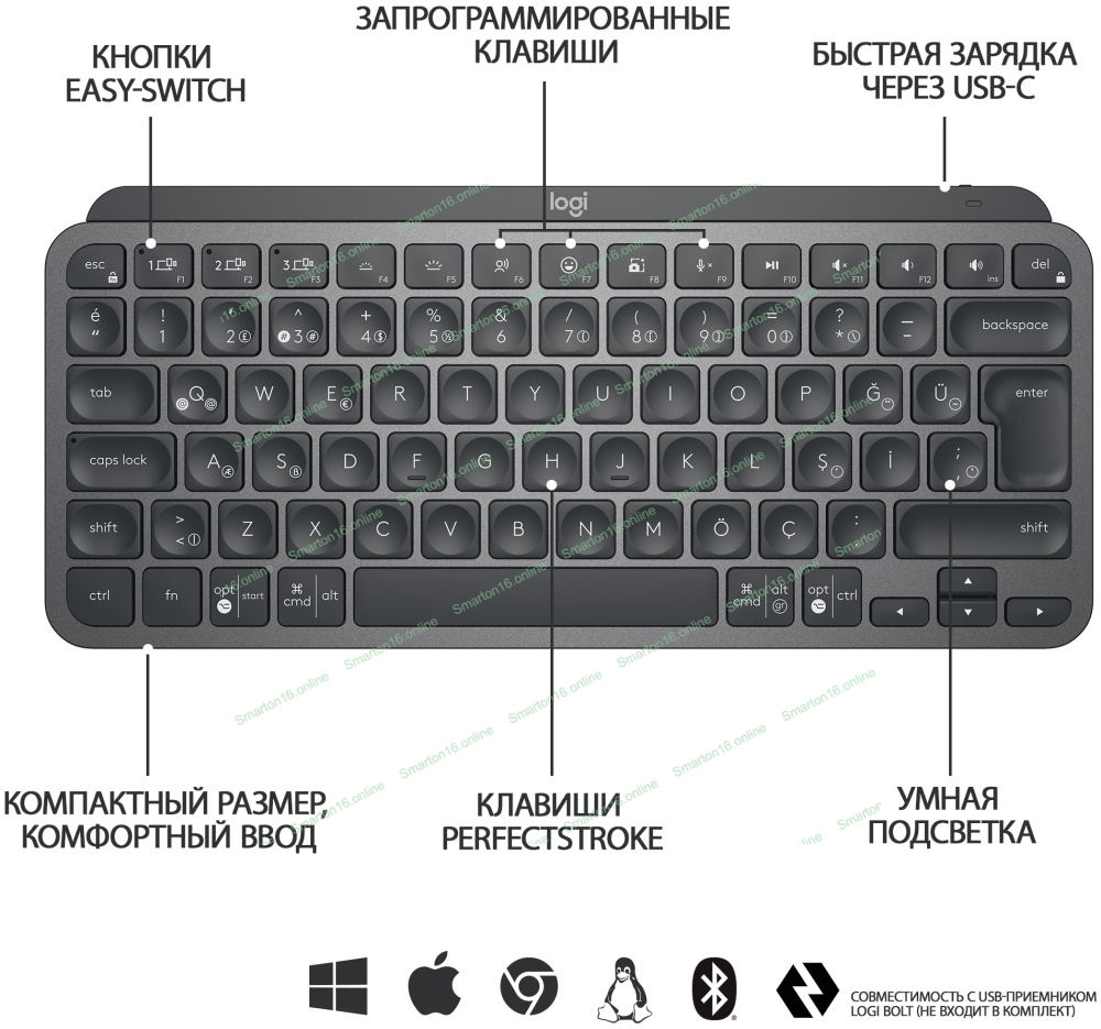 Клавиатура беспроводная Logitech MX Keys Mini (920-010501), USB, Bluetooth/Радиоканал, темно-серый/черный