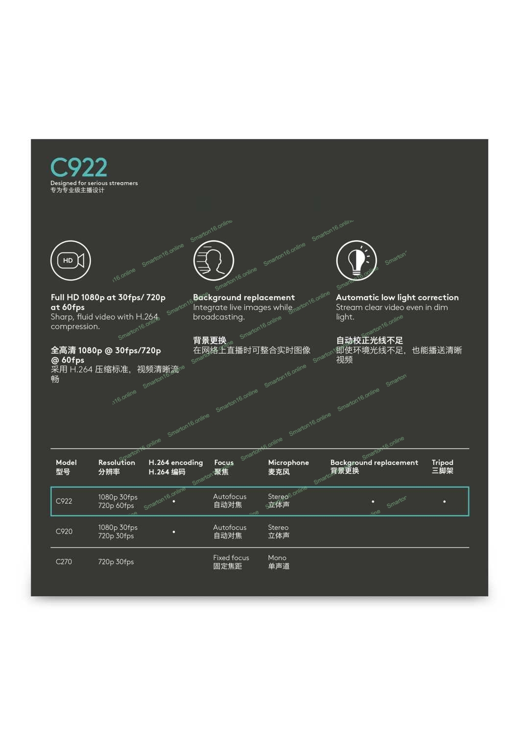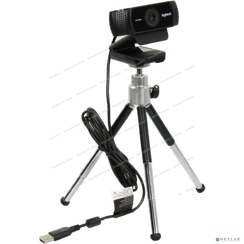 Веб-камера Logitech C922 Pro Stream 1920x1080, 30 кадр/с, USB Type-A, микрофон (2 шт, шумоподавление), автоматическая фокусировка, автоосвещение, универсальное крепление