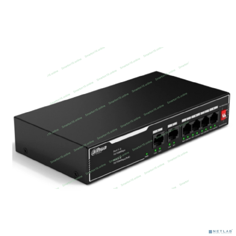 Коммутатор неуправляемый 6-портовый с РоЕ Dahua DH-SF1006LP, 4xRJ45 100Mb PoE, 2xRJ45 100Mb uplink, суммарно 36Вт, коммутация 1.2 Гбит/с, MAC-таблица 2K, металл