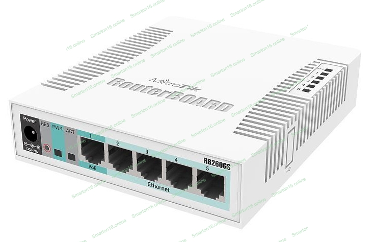 Коммутатор сетевой MikroTik RB260GS RouterBOARD 260GS 5-port Gigabit smart switch with SFP cage, SwOS, plastic case, PSU