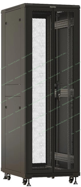 Шкаф серверный Hyperline (TTbR-4261-DD-RAL9004) напольный 42U 600x1000 мм пер. дв. перфор. задн. дв. перфор. 2 бок.пан. направл. под закл.гайки 800кг черный 910 мм 2055 мм IP20 сталь