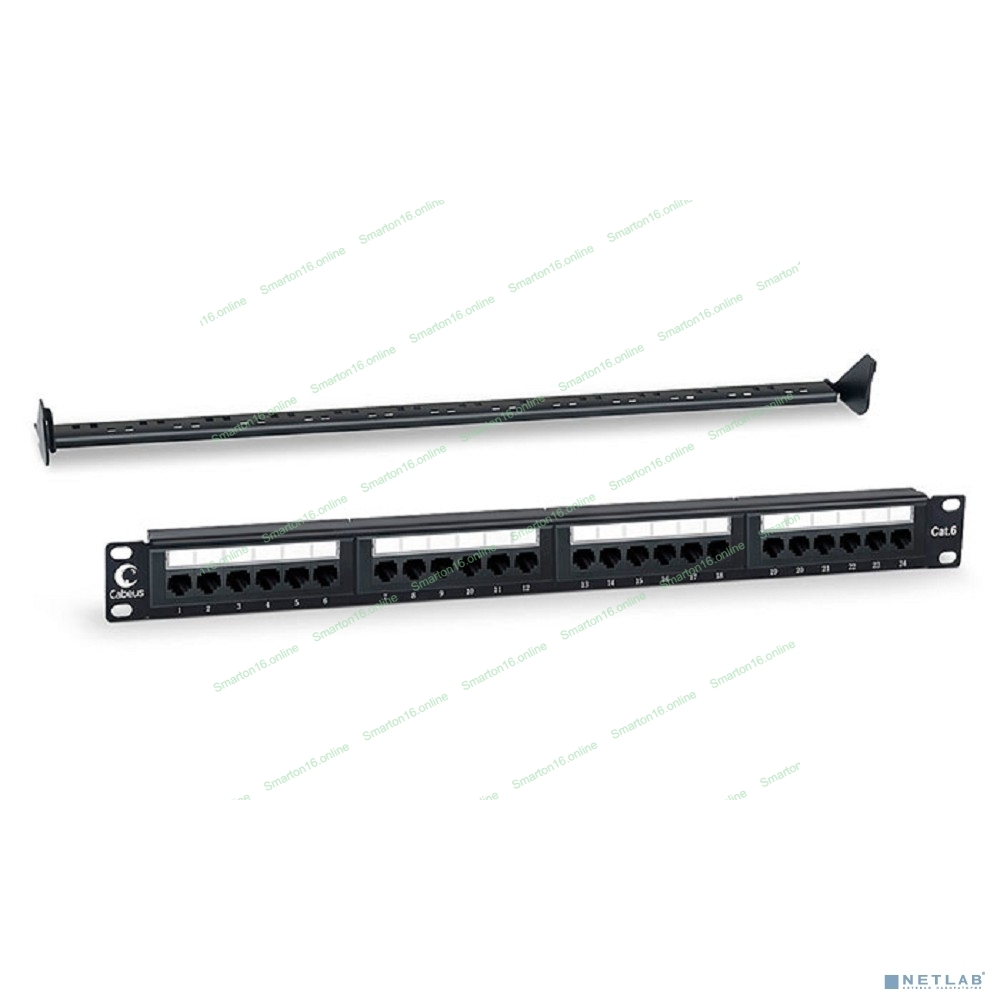 Комм. патч-панель Cabeus, 19", 1HU, портов: 24 х RJ45, кат. 6, неэкр., черный, (PL-24-Cat.6-Dual)