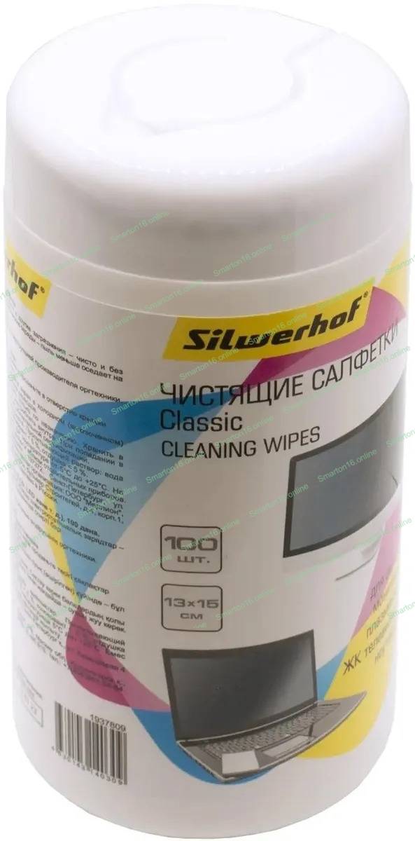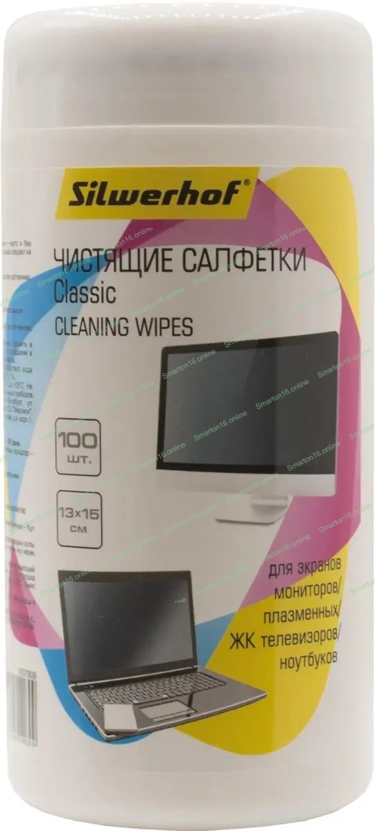 Салфетки Silwerhof Classic для экранов мониторов/плазменных/ЖК телевизоров/ноутбуков туба 100 шт влажных