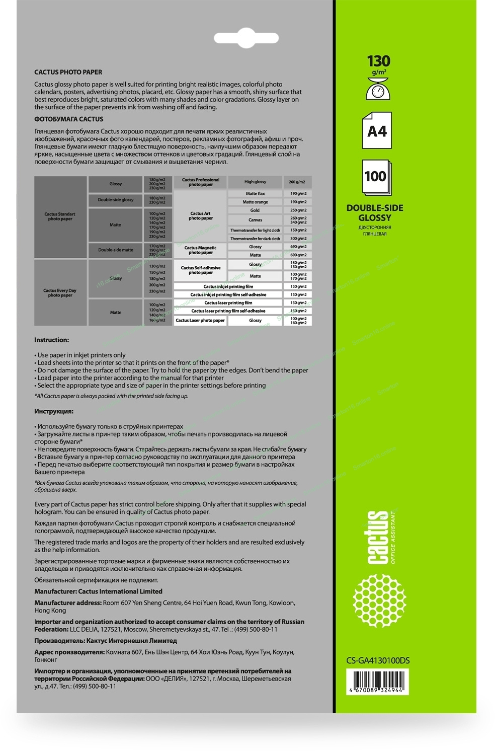 Фотобумага Cactus CS-GA4130100DS A4/130г/м2/100л./белый глянцевое/глянцевое для струйной печати