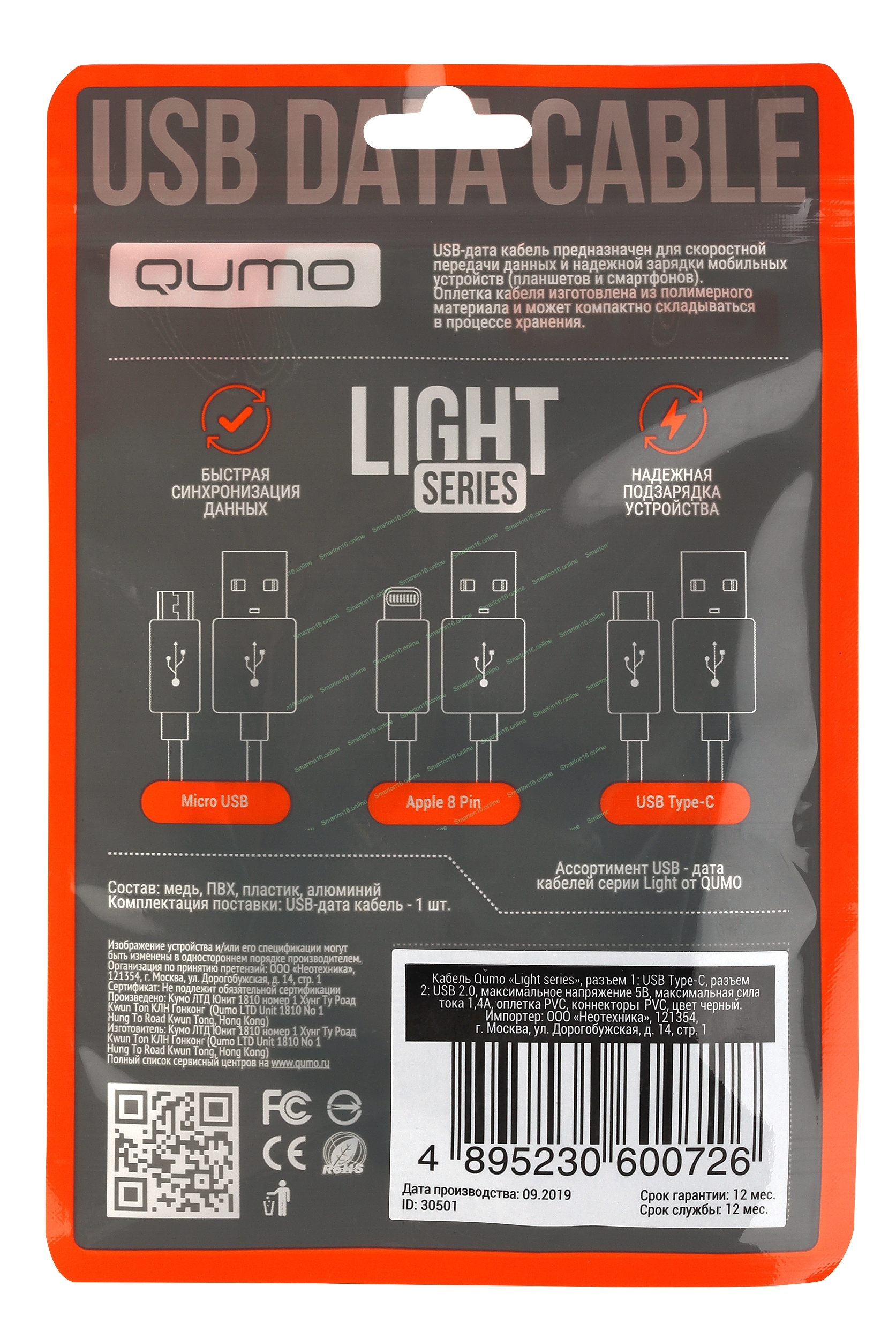 Кабель Qumo light series, USB-Type C, 1м, 5В, 1A, опл. PVC, кон. PVC, круглый, черный