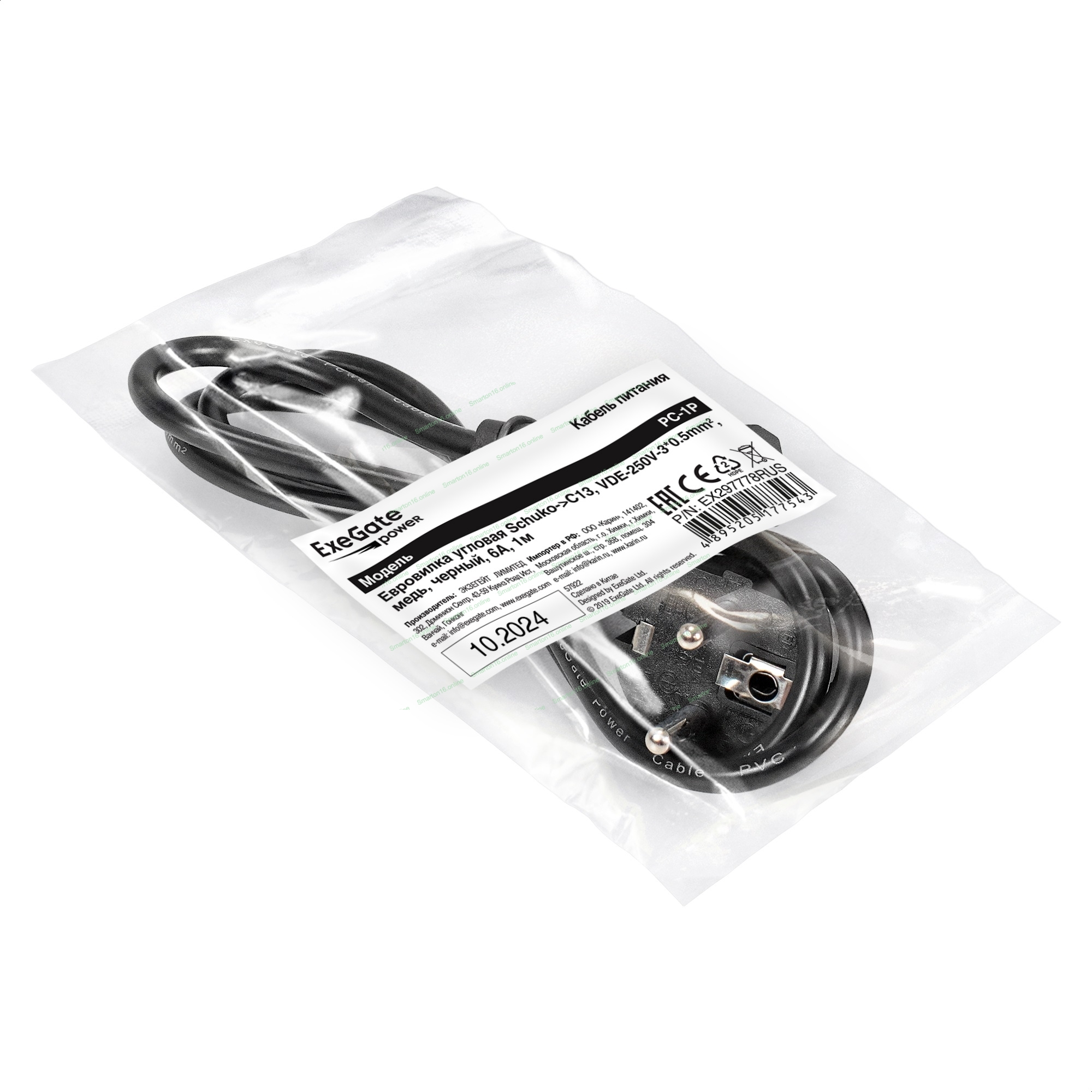 Кабель питания ExeGate Power PC-1P (Евровилка угловая Schuko->C13, VDE-250V-3*0.5мм2, медь, черный, 6A, 1м)