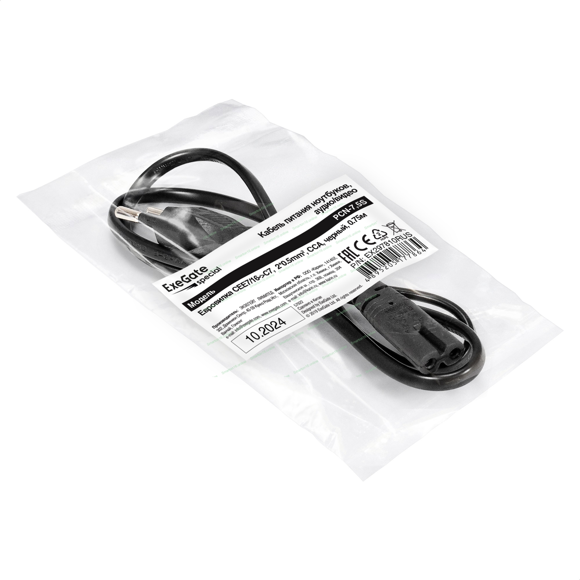 Кабель питания ноутбуков, аудио/видео ExeGate Special PCN-7,5S (Евровилка CEE7/16->C7, 2*0.5мм2, CCA, черный, 0.75м)