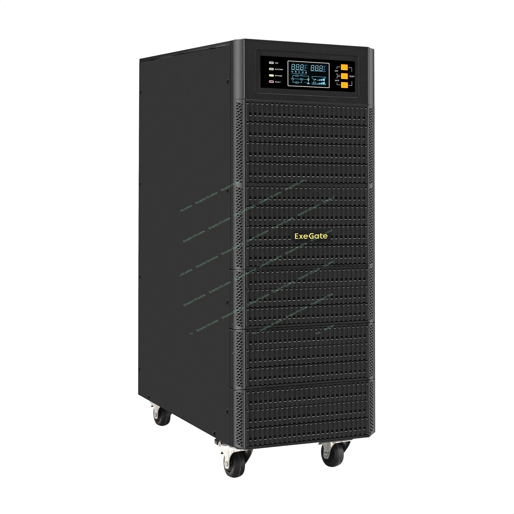 Источник бесперебойного питания On-line ExeGate PowerExpert TL-575-10kVA.192V.LCD.AVR.T.USB.RS232.SNMP 10000VA/10000W, On-Line, PF=1, LCD, клеммы, RS232, USB, SNMP-slot, встроенные батареи 12V 7.2Ah - 16шт, возможность подключения до 4 внешних батарейных блоков 192В, Tower, металлический корпус на колесиках, черный
