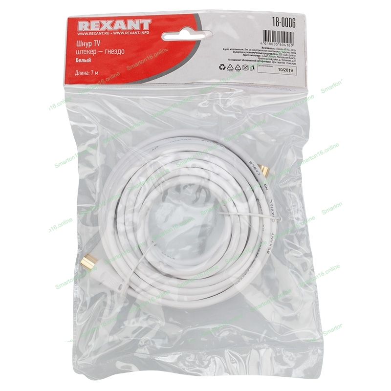 Шнур Rexant ТВ гнездо - ТВ штекер, длина 7 метров, белый