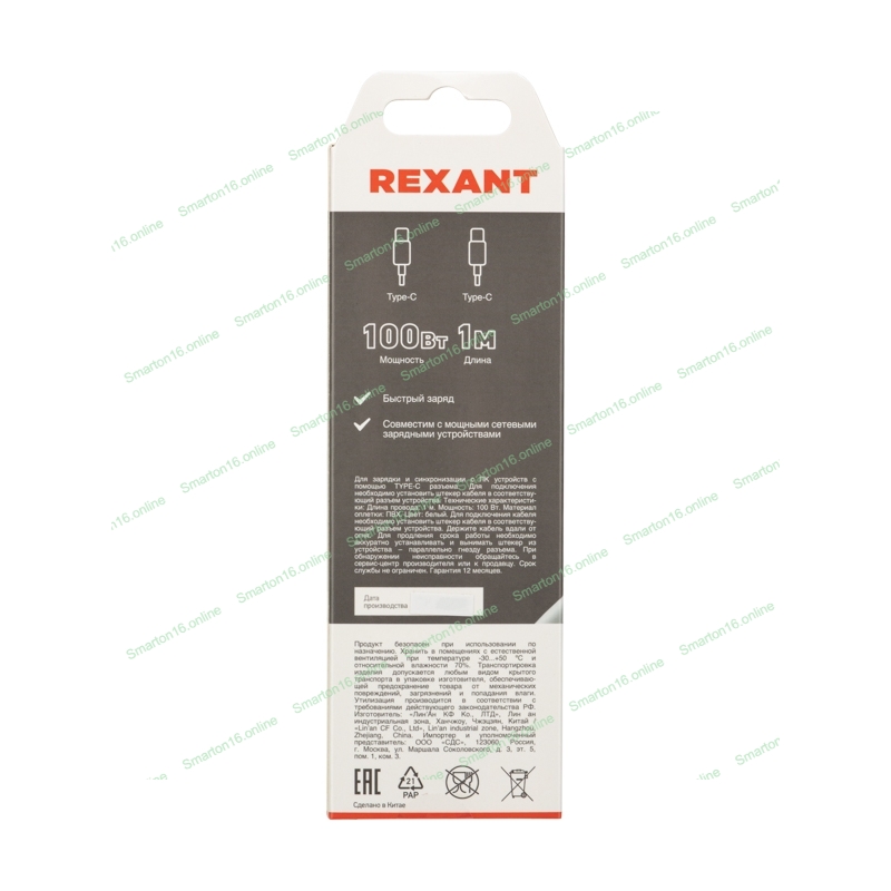 Кабель Rexant Type-C - Type-C PD 100W/1м/PVC/белый