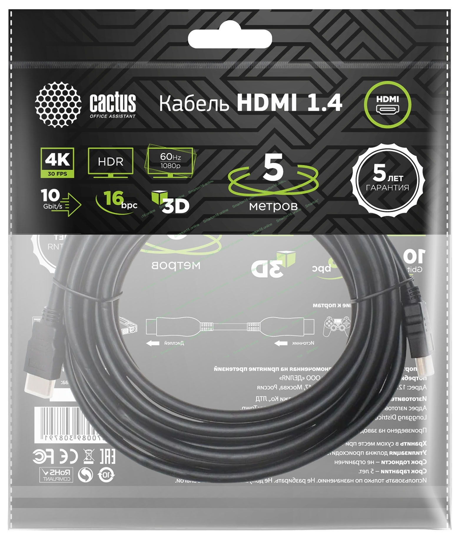 Кабель аудио-видео Cactus CS-HDMI.1.4-5 HDMI (m)/HDMI (m) 5м. позолоченные контакты черный