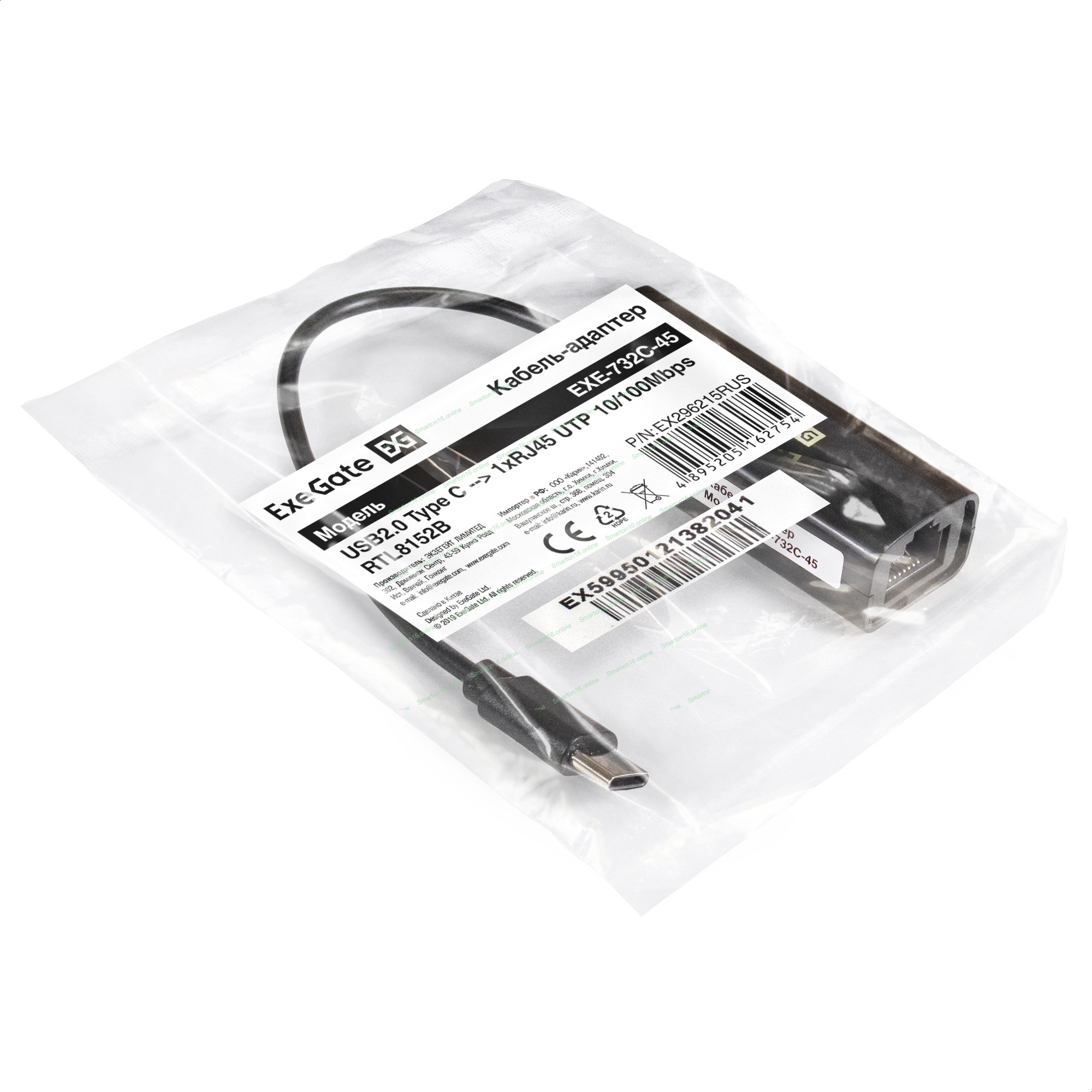 Кабель-адаптер ExeGate EXE-732C-45 (USB2.0 Type-C --> 1xRJ45 UTP 10Mbps/100Mbps, Realtek Chipset RTL8152B)