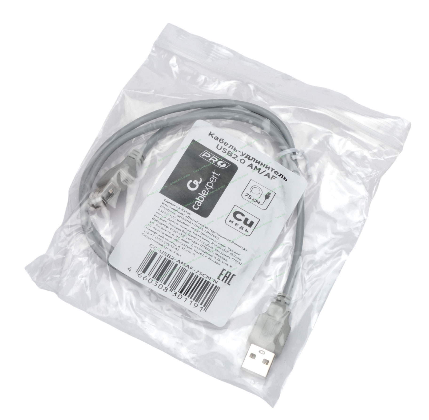 Кабель-удлинитель USB2.0 Cablexpert CC-USB2-AMAF-75CM-N, AM/AF, медь, Pro, 75 см, серый, пакет