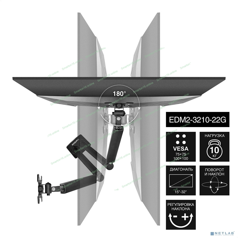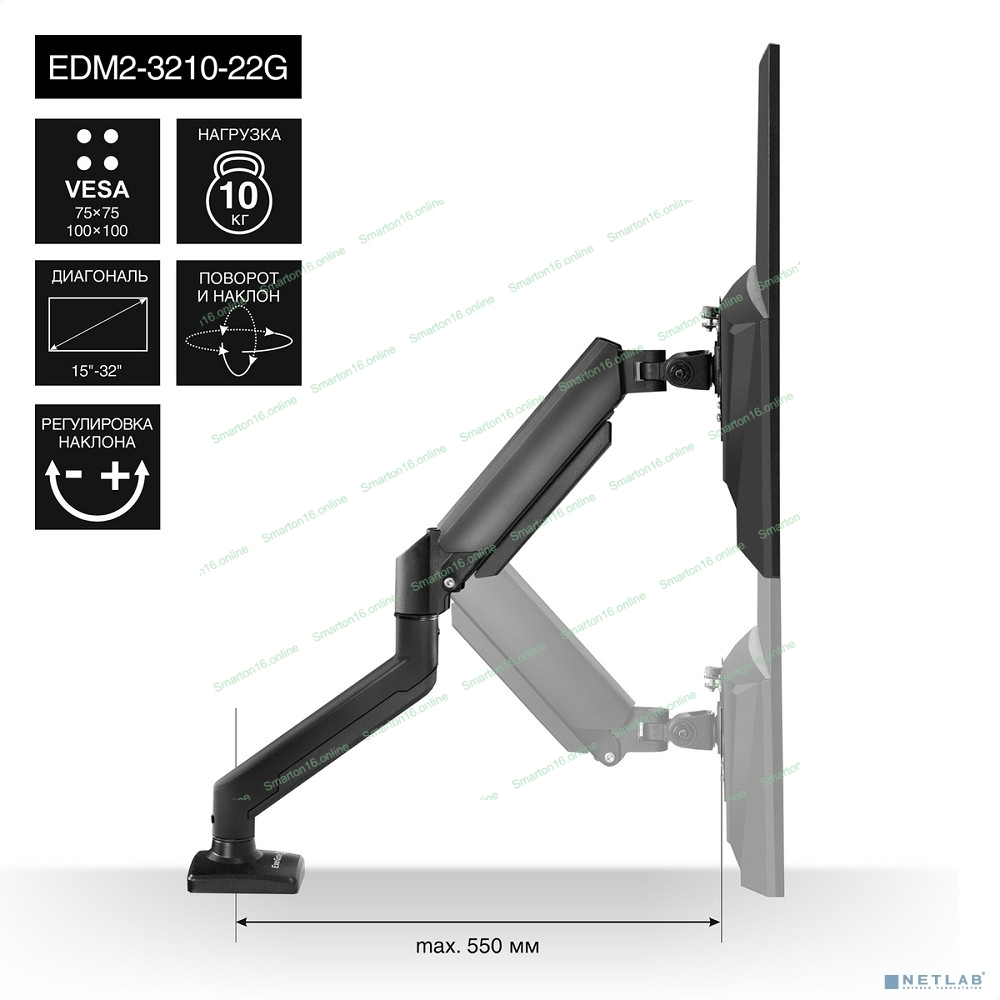 Настольное крепление ExeGate EDM2-3210-22G (кронштейн для двух мониторов 15"- 32", газовая пружина, VESA 75x75, 100x100 мм, нагрузка на один кронштейн 2-10 кг, наклон -45°/+90°, поворот-90°/+90°, вращение 360°, 2 способа крепления: сквозное и струбцина, черный)