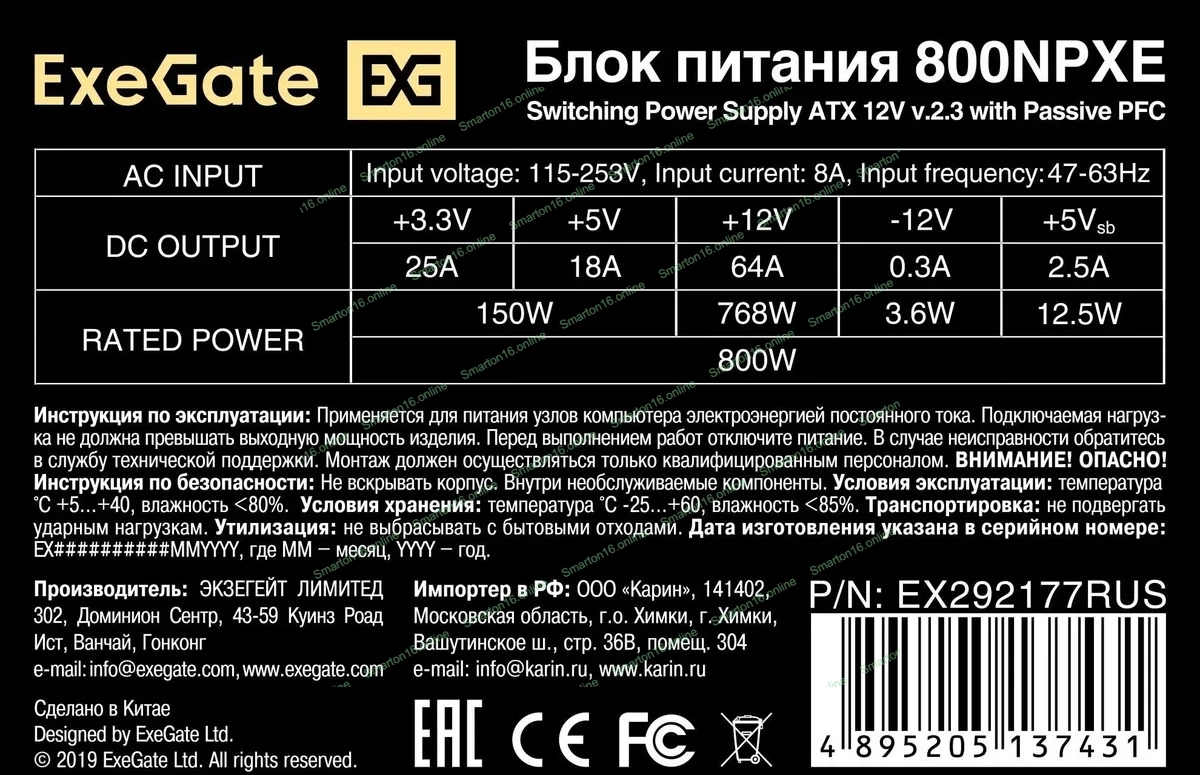 Блок питания 800W ExeGate 800NPXE (ATX, PPFC, SC, 12cm fan, 24pin, (4+4)pin, 2xPCI-E, 5xSATA, 3xIDE, черный, кабель 220V 1,8м с защитой от выдергивания)