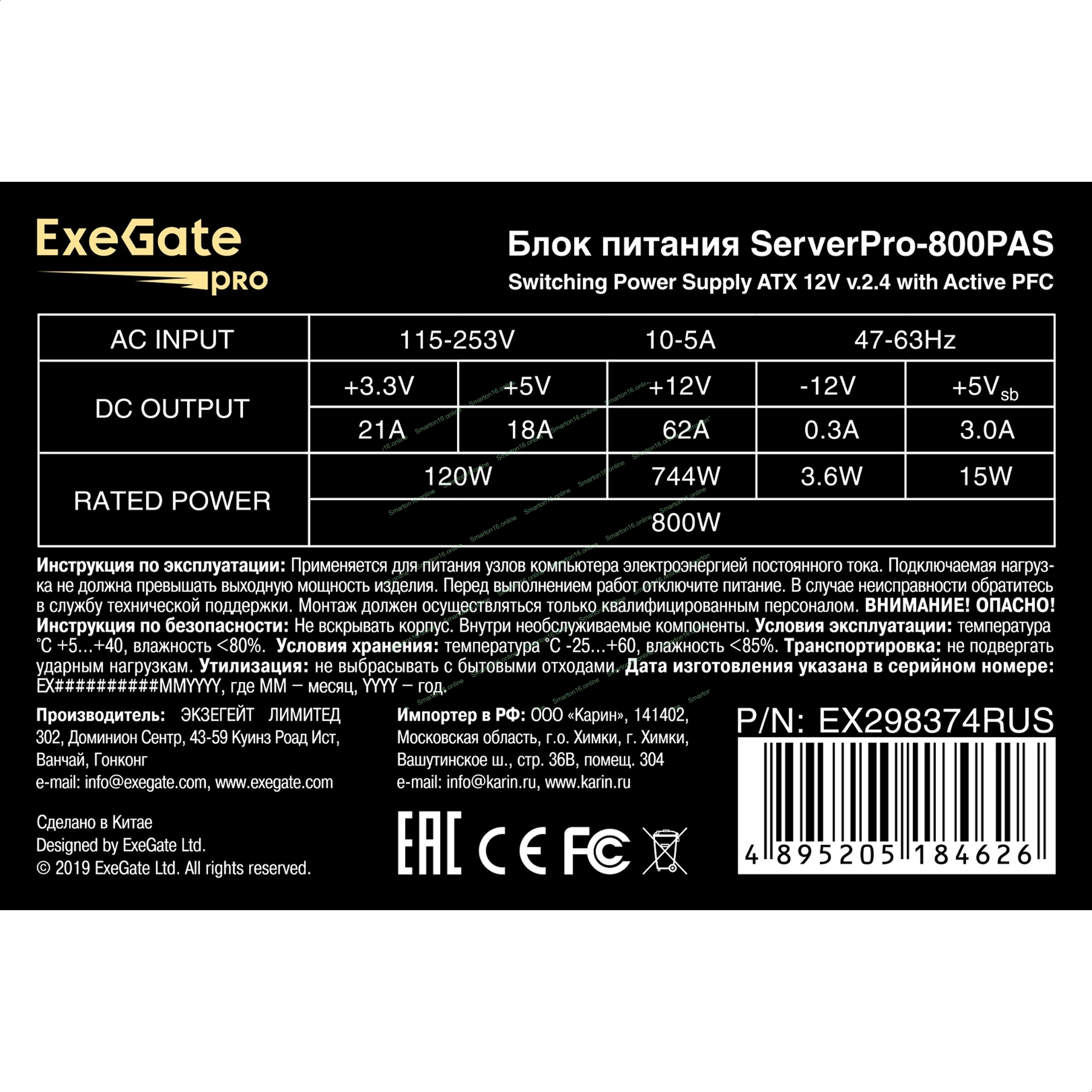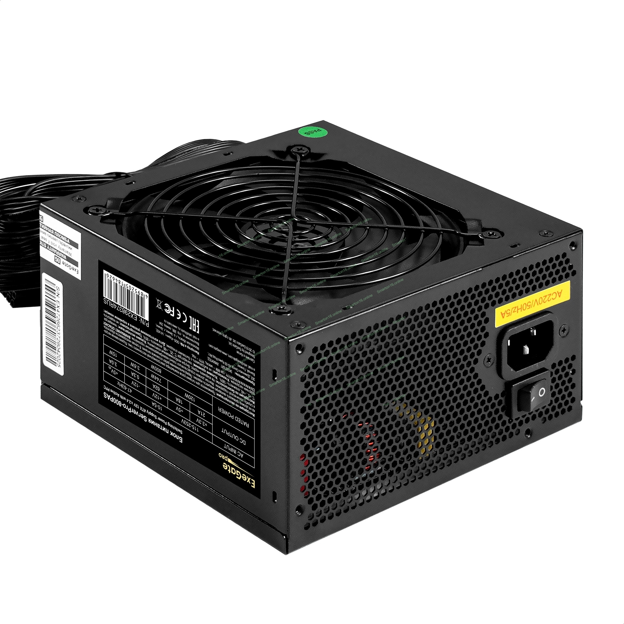 Блок питания серверный 800W ExeGate ServerPRO-800PAS (ATX, APFC, КПД 80% (80 PLUS), 12cm fan, 24pin, 2x(4+4)pin, 6xPCI-E, 8xSATA, 4xIDE, Cable Management, black)