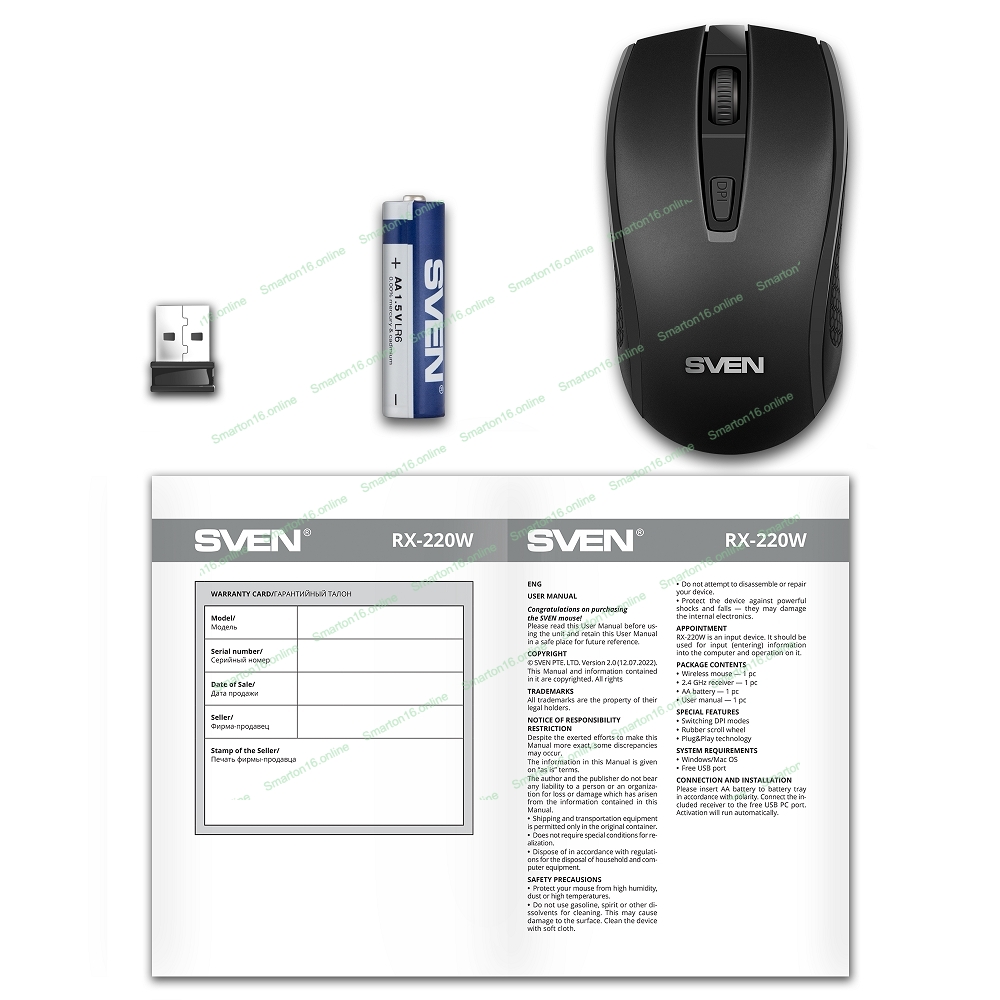 Мышь беспроводная SVEN RX-220W черный, 1600 dpi, радиоканал, USB, кнопки - 4