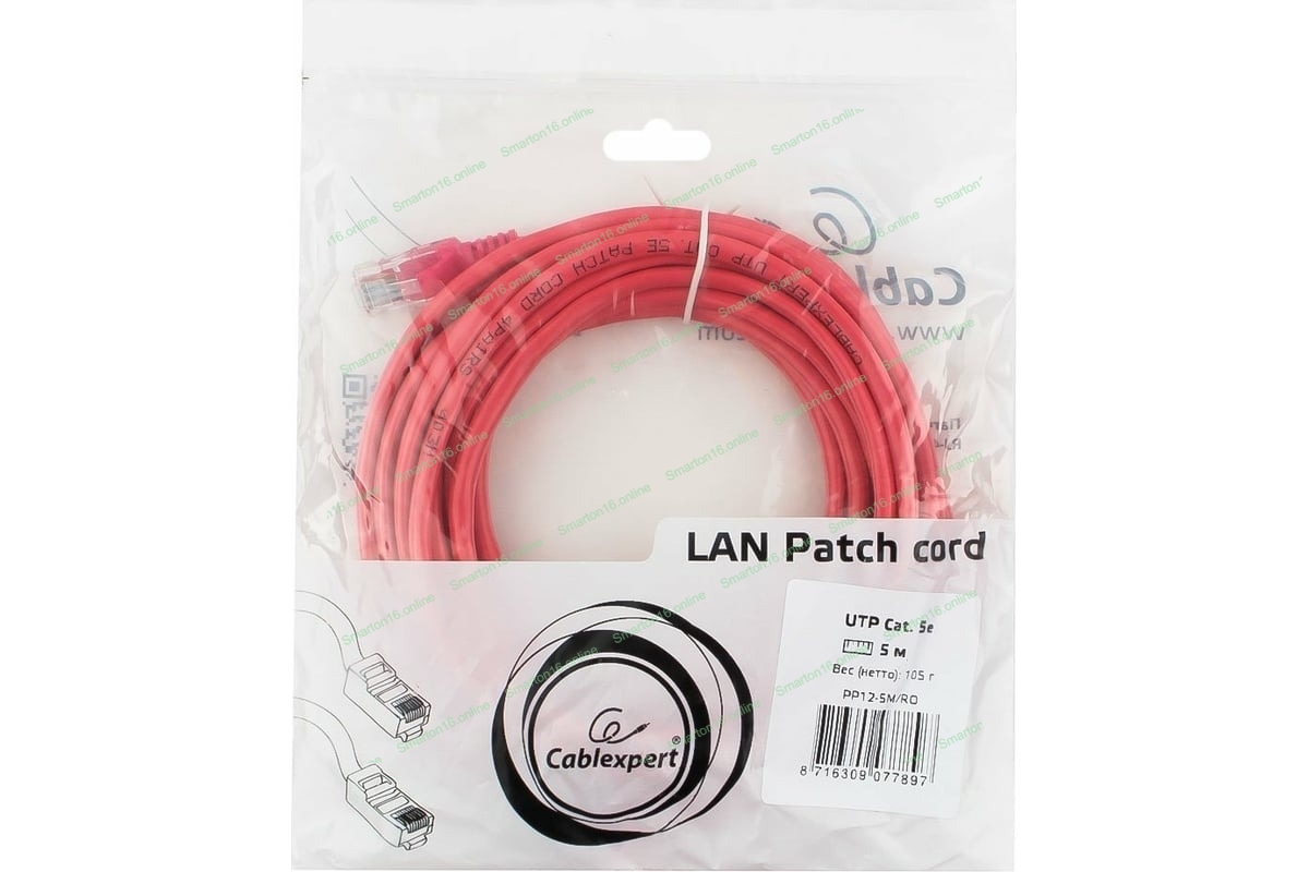 Патч-корд UTP Cablexpert cat.5e, 5м, литой, многожильный (красный)