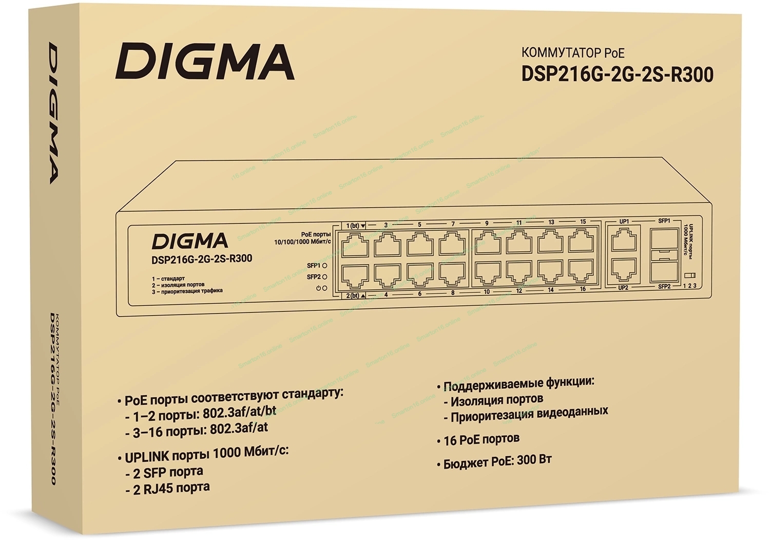 Коммутатор Digma DSP216G-2G-2S-R300 (L2) 18x1 Гбит/с 2SFP 16PoE 16PoE+ 2PoE++ 300W неуправляемый