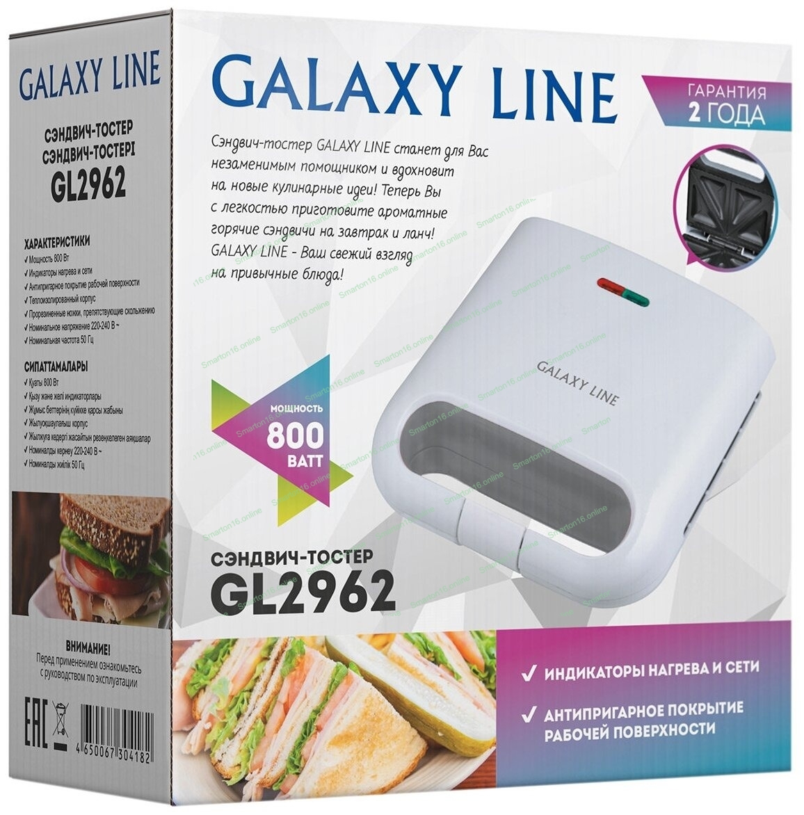 Сэндвич-тостер Galaxy Line GL 2962, белый, с несъемными пластинами, 800 Вт, индикаторы нагрева и сети, антипригарное покрытие рабочей поверхности, теплоизолированный корпус, прорезиненные ножки, препятствующие скольжению