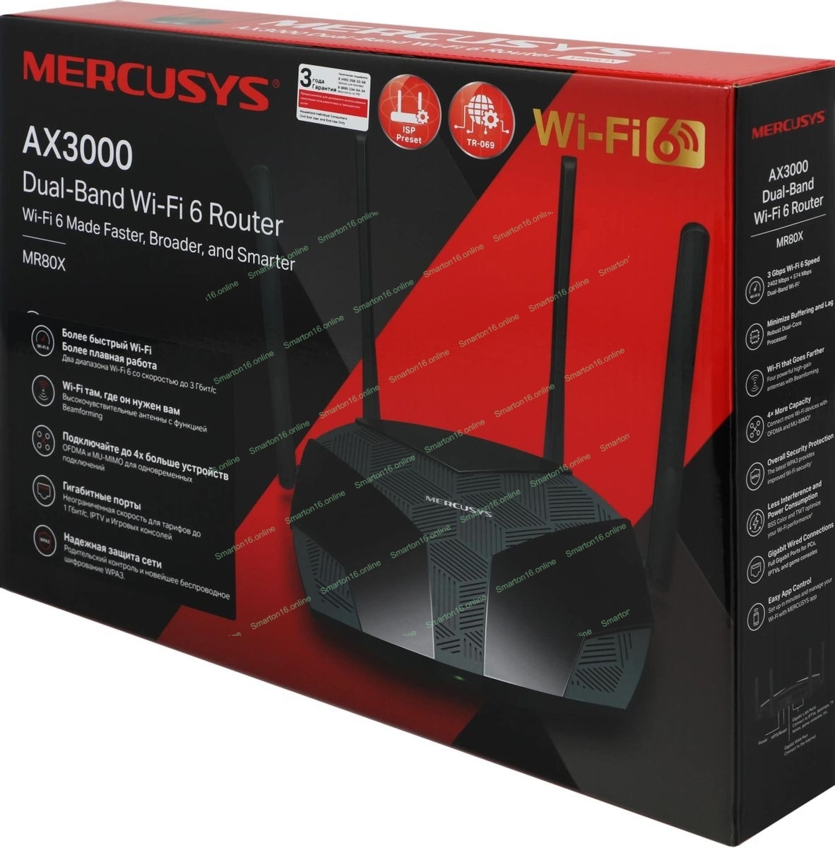 Двухдиапазонный роутер MERCUSYS MR80X AX3000 Wi-Fi 6, до 574 Мбит/с на 2,4 ГГц + до 2402 Мбит/с на 5 ГГц,4 фиксированные внешние антенны, 3 гигабитных порта LAN, 1 гигабитный порт WAN