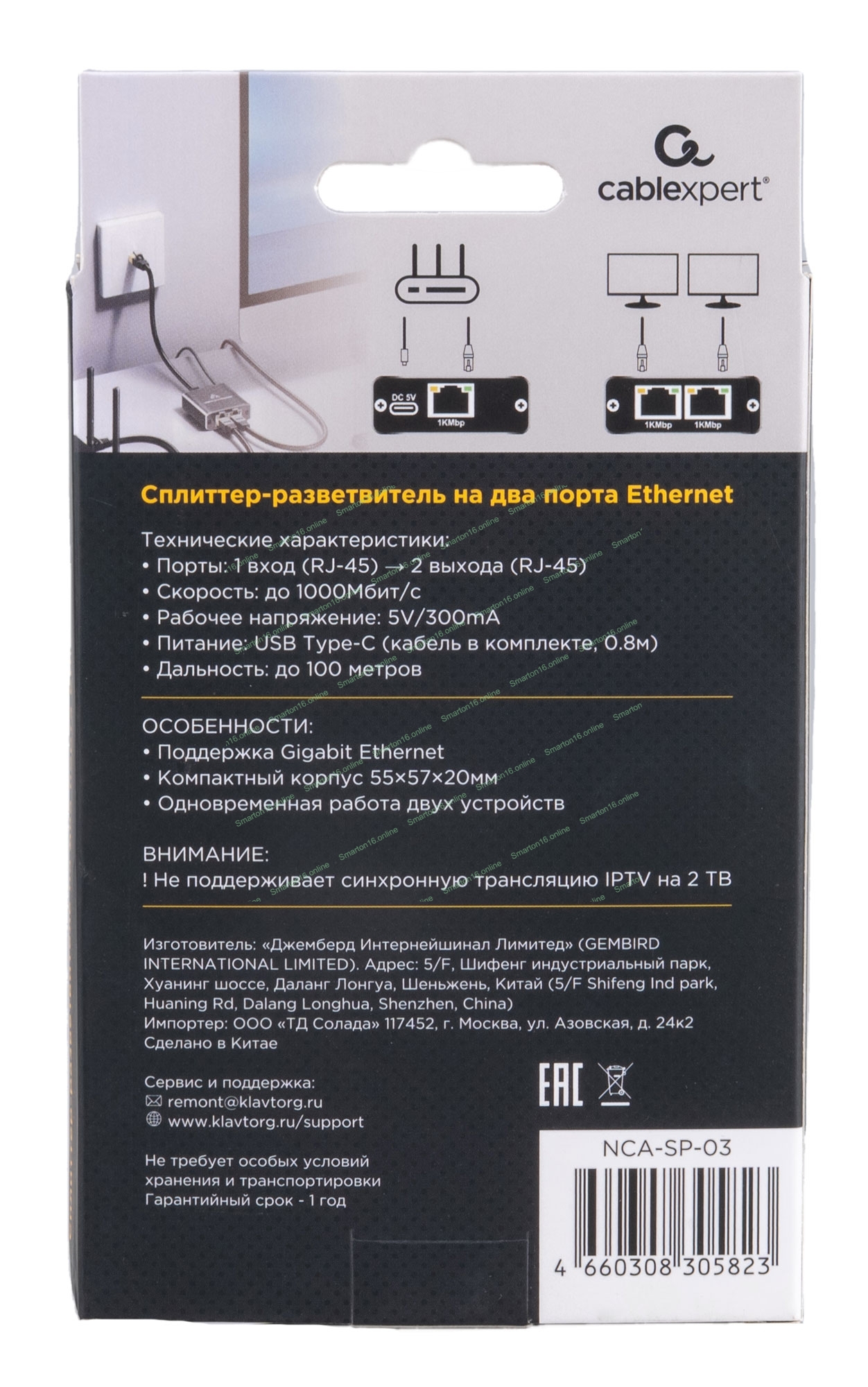 Сплиттер-разветвитель Cablexpert с питанием, 1 порт RJ45 -> 2 порта RJ45 100/1000Mbps, NCA-SP-03, коробка