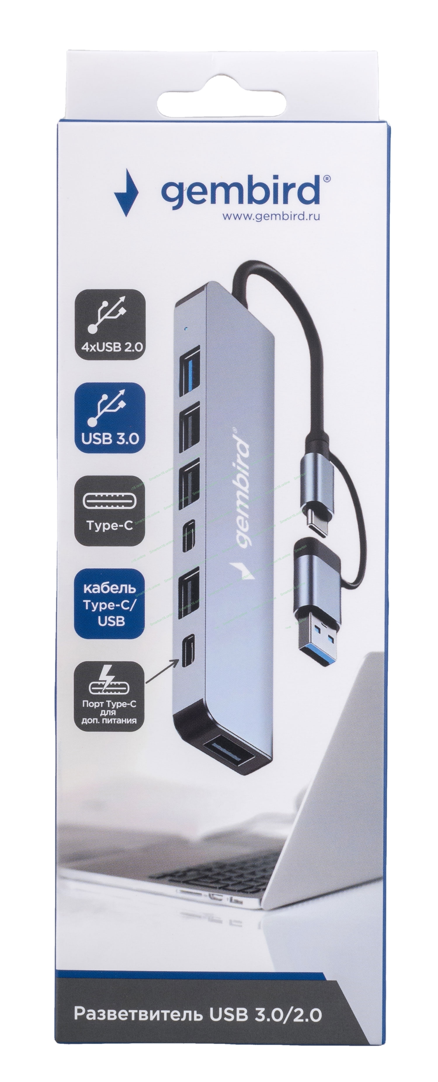 Разветвитель USB3.0/2.0 Gembird UHB-C445, USB3.0, 4хUSB2.0, Type-C, с доп.питанием (порт Type-C), кабель Type-C/USB 17см, алюминий, коробка