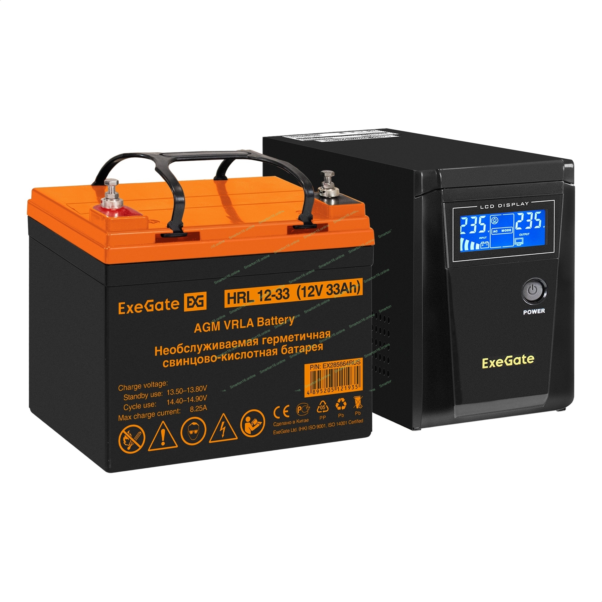 Комплект Источник бесперебойного питания EX295986RUS + батарея 33Aч EX285664RUS 1шт (инвертор, синус, для котла) ExeGate SineTower SZ-600.LCD.AVR.1SH <600VA/360W, чистый синусоида, LCD дисплей, AVR, 1*Schuko, линейно-интерактивный, Black> + батарея ExeGate HRL 12-33 (12В, 33Ач) 1шт