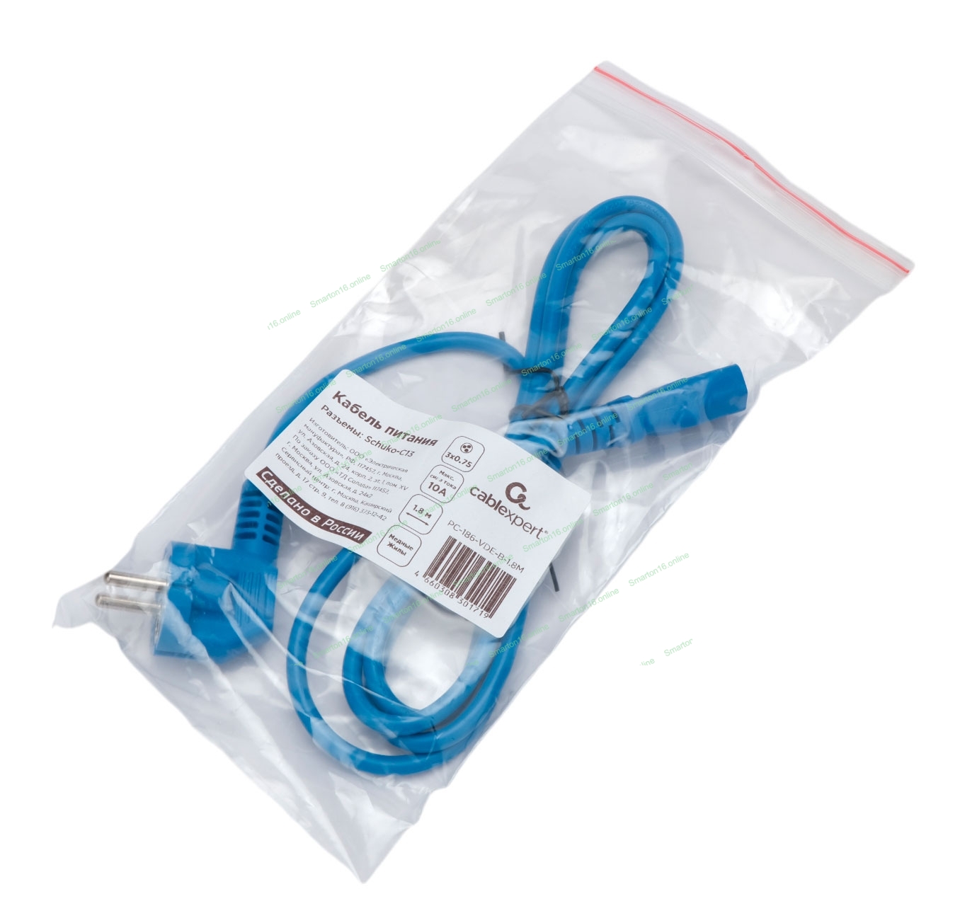Кабель питания Cablexpert PC-186-VDE-B-1.8M, Schuko-C13, 3x0.75мм2, 10A, с заземлением, медь, 1.8м, синий, пакет