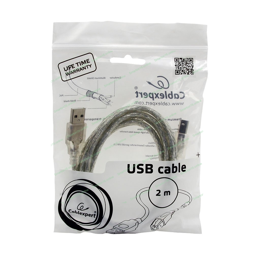 Кабель Cablexpert USB2.0 Pro, AM/BM, 2м, экран, 2 феррит.кольца, прозрачный (CCF-USB2-AMBM-TR-2M)