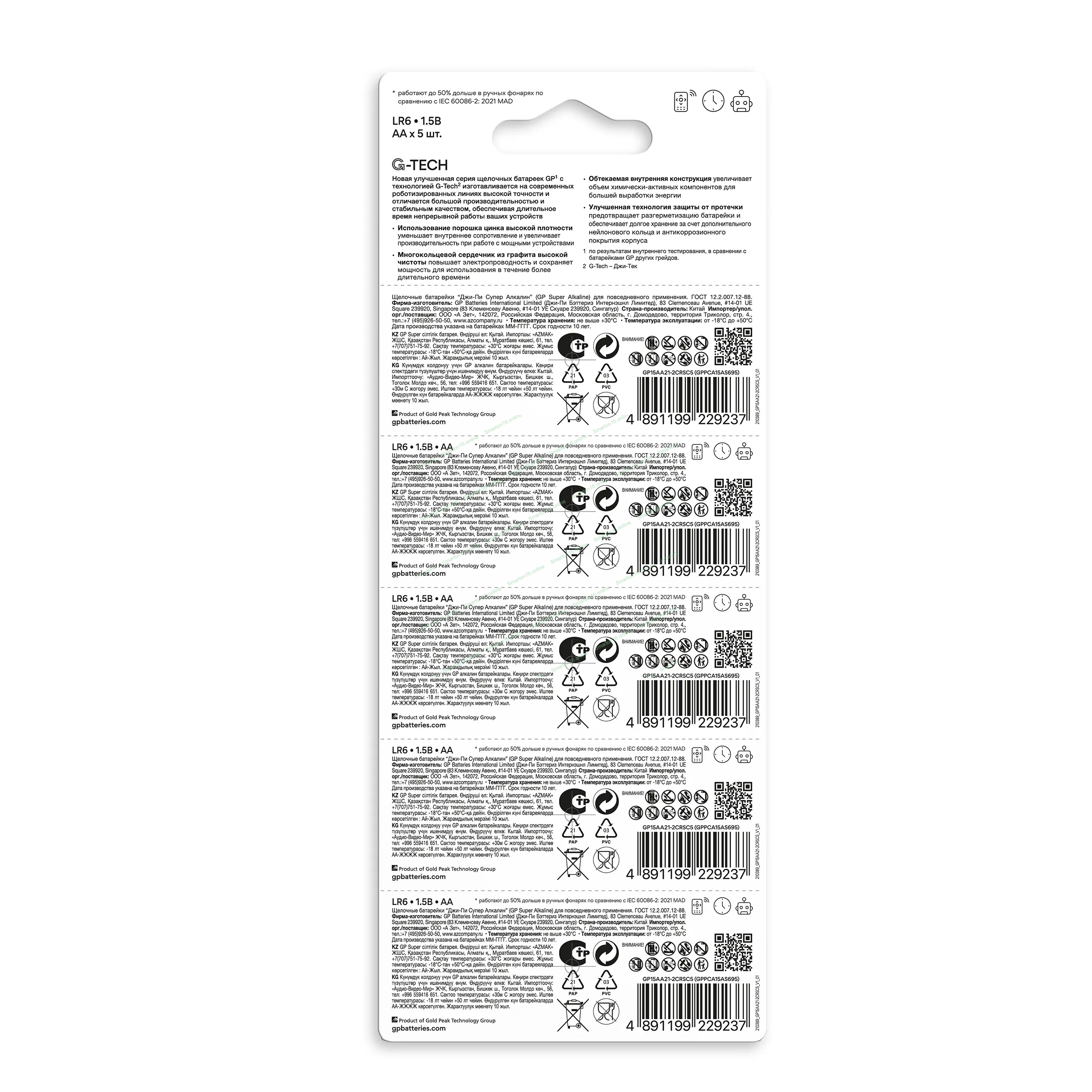 Алкалиновые батарейки GP Super Alkaline G-Tech 15А АA - 1 шт. на отрывных блистерах
