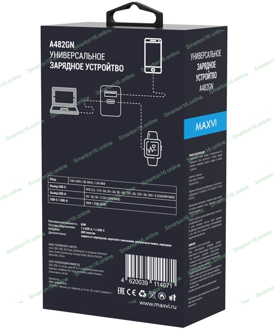 Сетевое зарядное устройство Maxvi A482GN 65W, 1xUSB-A, 1xUSB-C, черный