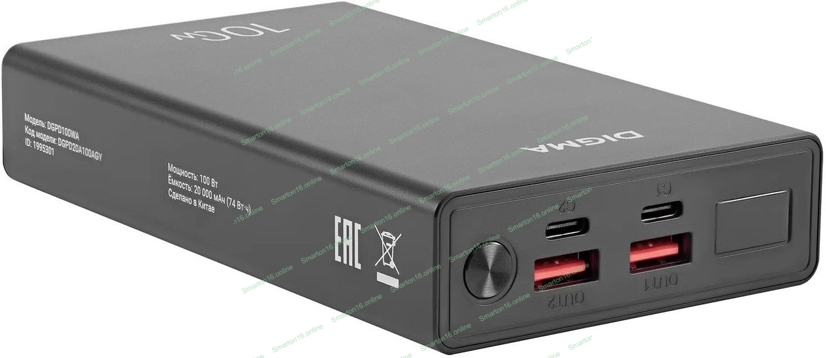 Портативный аккумулятор Digma DGPD100WA 20000mAh QC3.0/PD3.0 100W 5A 2xUSB-A/2xUSB-C черный