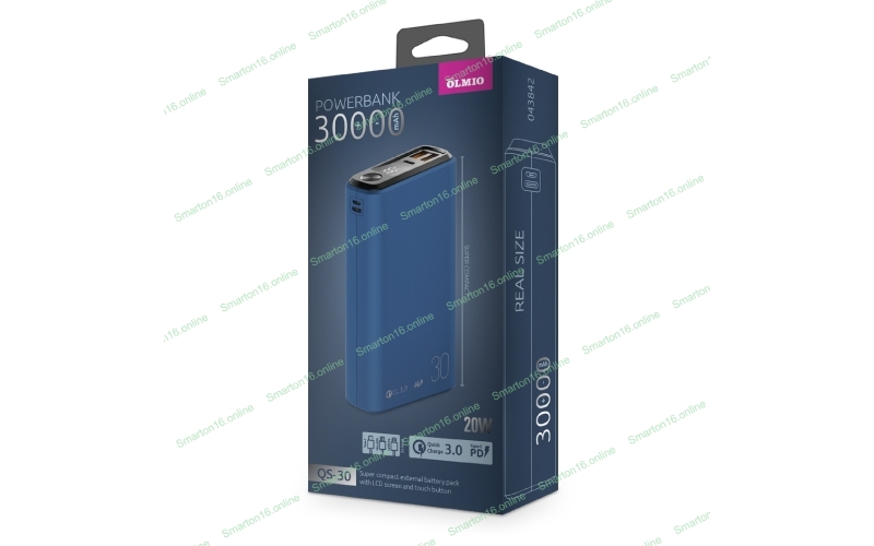 Портативный аккумулятор OLMIO QS-30, 30000mAh, 22.5W, QuickCharge3.0/PowerDelivery, LCD, темно-синий